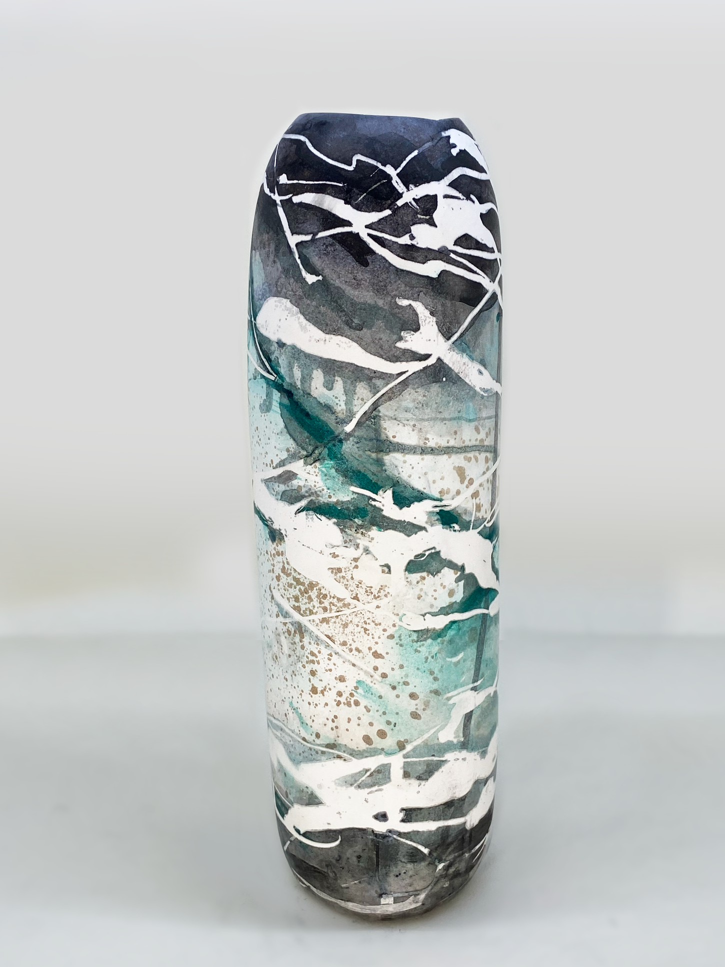 Titled “Blurred Lines,” this artwork draws inspiration from my personal journey.The lines within the piece symbolise the diverse paths to success, acknowledging the multitude of routes that may sometimes become obscured and blurred. What initially appears straightforward and clear-cut black & white reveals shades of grey, with bursts of vibrant color. The warm tones serve as a reassuring reminder that everything will eventually fall into place and be alright. The break in the vessel serves as a visual representation of individualism, underlining the uniqueness of each person, as no two individuals